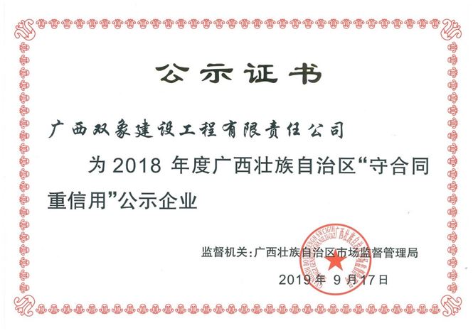 近日,经自治区市场监督管理局严格审查、考评,广西北投交通养护科技集团工程有限责任公司凭借良好的社会信誉和企业实力,荣获2018年度广西“守合同重信用”荣誉称号。