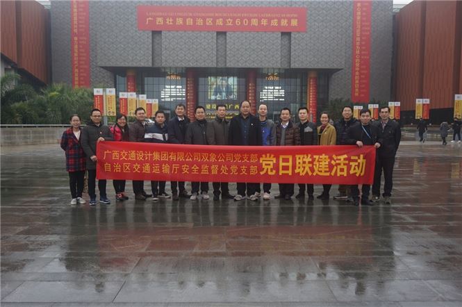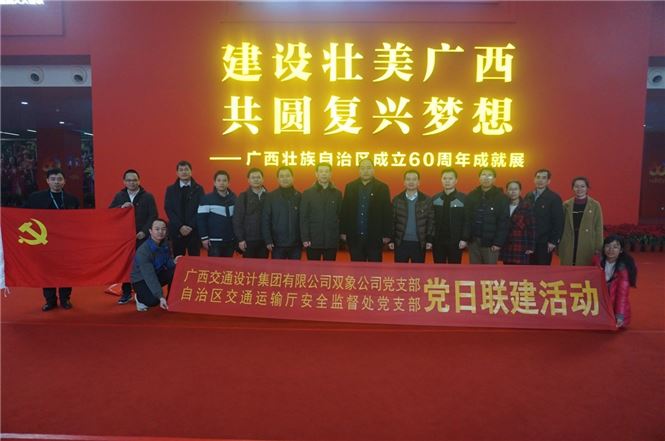 广西规划馆气象一新,盛装以待迎接广西壮族自治区成立60周年。2019年1月4日,细雨初歇,北投交通养护科技集团党支部沿着自治区成立60周年大庆活动的步伐,与自治区交通运输厅安全监督处党支部共同开展党日联建活动---组织前往广西规划馆参观《建设壮美广西 共圆复兴梦想——广西壮族自治区成立60周年成就展》,了解自治区的发展历程和各项事业取得的长足进步。自治区交通安全监督处调研员王永兴、副处长姚凤金,集团公司总工程师林增海、北投交通养护科技集团党支部书记吴小流及两支部的党员参加了本次活动。
