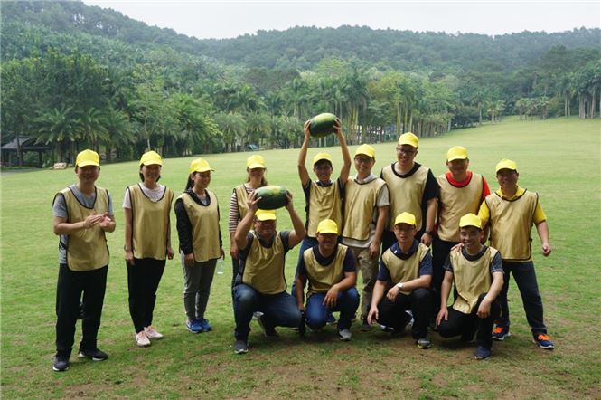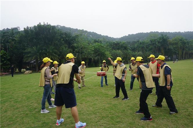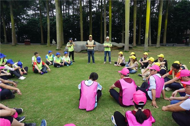 到达环山秀坪大草地后,小伙伴们分别以“大黄蜂”、“粉红社会人”及“美丽大哥大”为组名组成三个小组展开团队建设活动。第一个项目是“鼓动人生”,每个小组的成员都必须在规定的时间内,通过牵拉鼓上的绳子,齐心协心用鼓面颠球。项目旨在启发团队成员目标一致、分工协作、相互激励、科学决策、细节管理等是决定团队是否能够高效完成任务的关键因素。第二个项目是“孤岛求生”,是假设所有的人都是海难幸存者且分别在盲人岛、哑人岛和自由岛三个岛上,除自由岛外,其他两岛将在40分钟后被海水淹没,要求所有幸存人员尽快脱离原岛到自由岛上等待救援。项目旨在启发团队成员加强沟通、信息共享、信任与合作、时间管理等是团队高效完成任务的助推器。