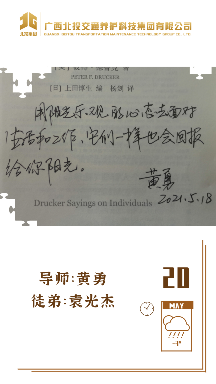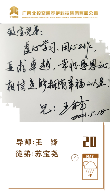 苏宝尧 清华大学本科生:人生旅途,遇见北投养护,遇见王锋导师,是幸运。我能读懂导师寄语中的深切勉励——虚心求教,踏实工作,也明白导师的殷切期望——志向高远,追求卓越。公司初创,蕴含着挑战和机遇,我亦正青春,未来希望在导师的教导指引下,不断拼搏,为公司发展添砖加瓦,创造自己的价值,实现人生幸福。