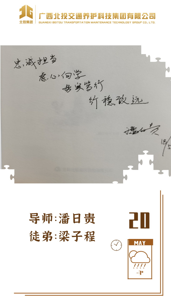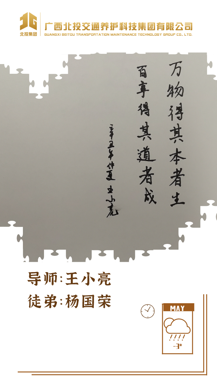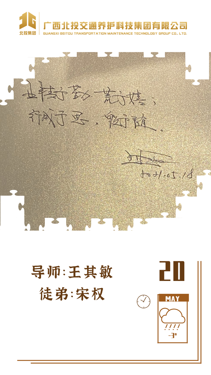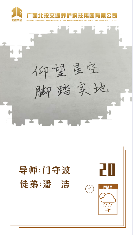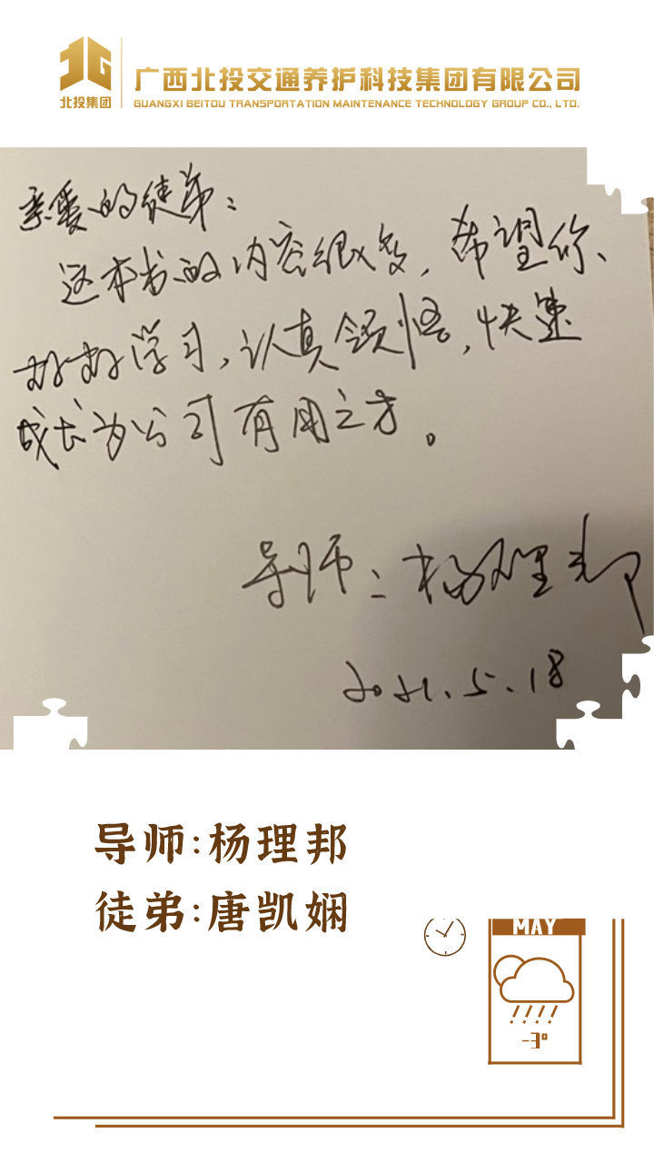 近日,39对师徒已经俩俩结对“成团出道”,接下来,为大家选取北投养护科技集团第一批“师徒团”里,部分导师与徒弟之间的温馨寄语、肺腑感言,感知北投养护科技集团溢于山海般的师徒情谊、人本关怀!