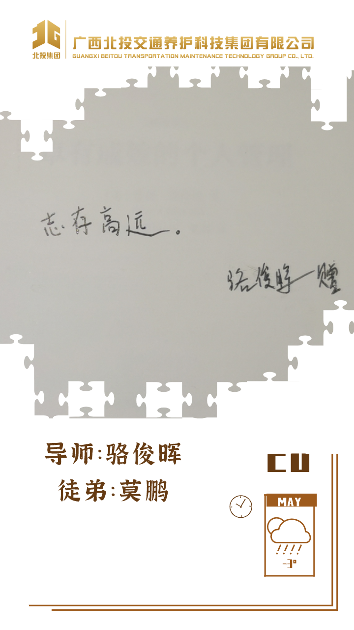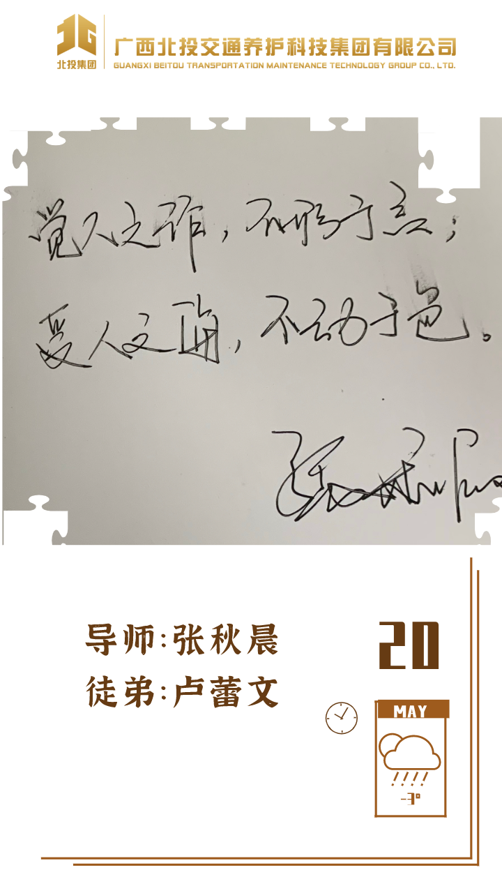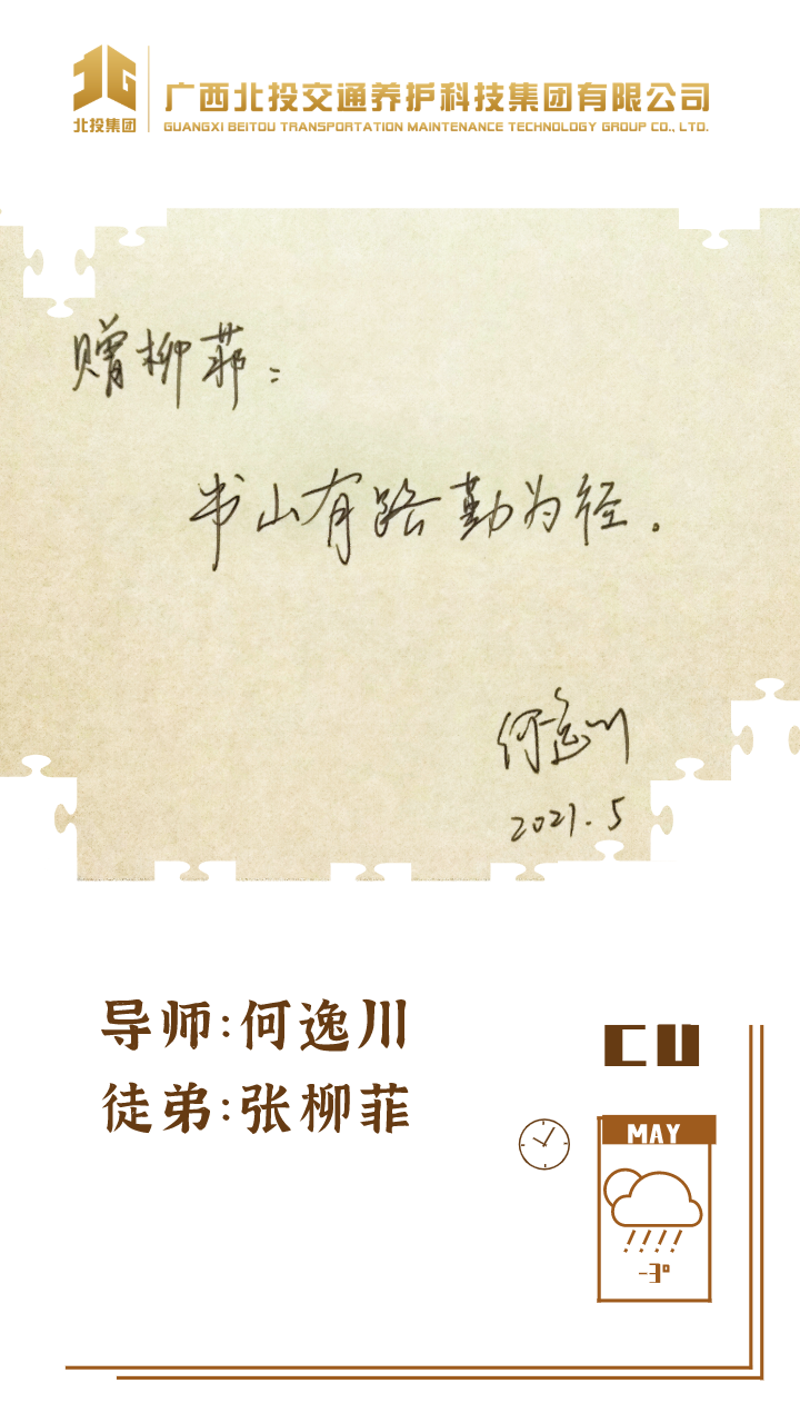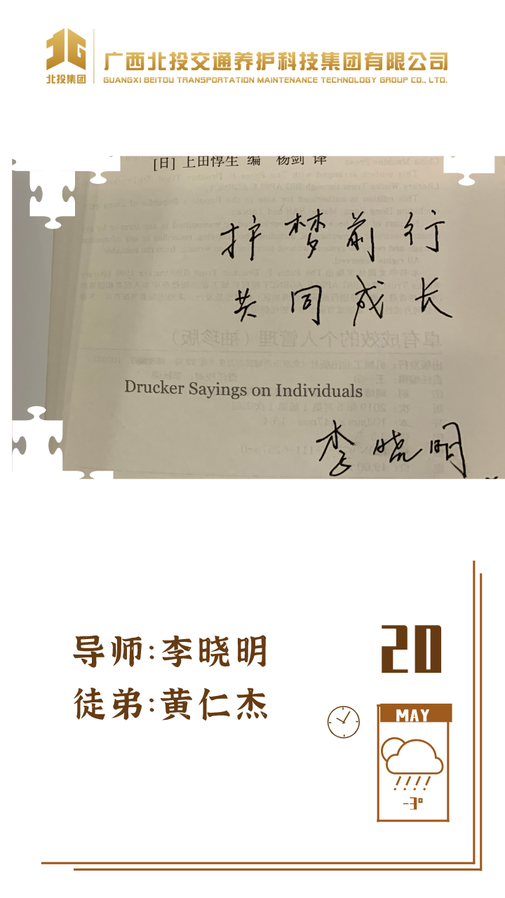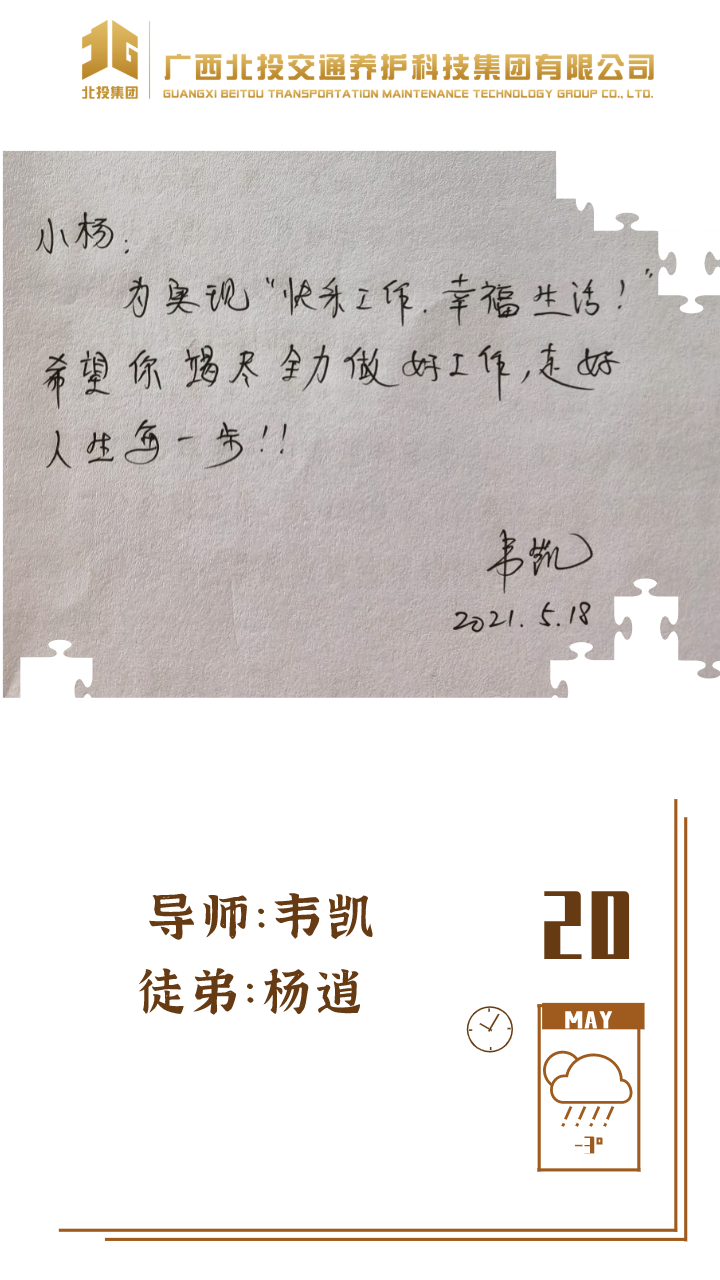 近日,39对师徒已经俩俩结对“成团出道”,接下来,为大家选取北投养护科技集团第一批“师徒团”里,部分导师与徒弟之间的温馨寄语、肺腑感言,感知北投养护科技集团溢于山海般的师徒情谊、人本关怀!