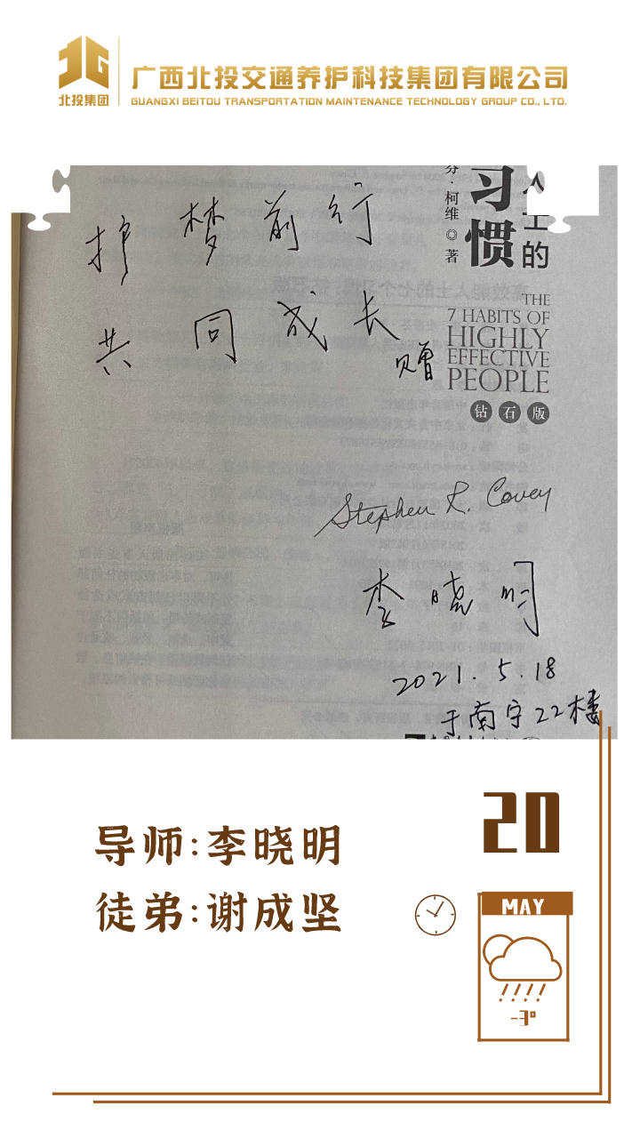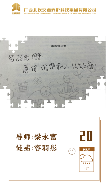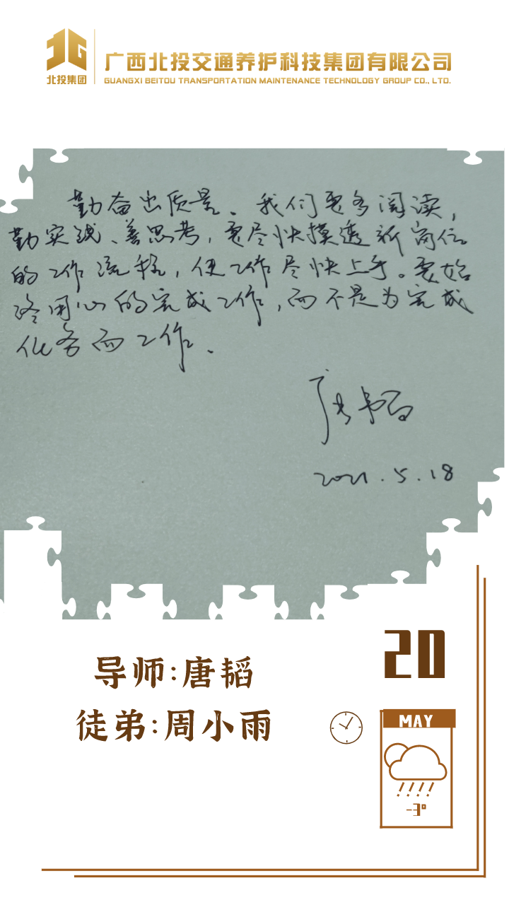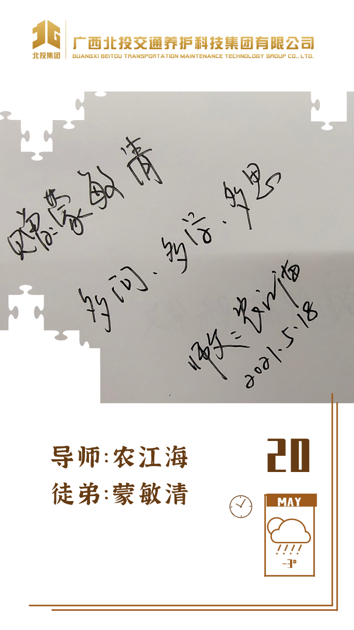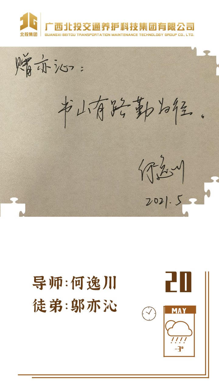 近日,39对师徒已经俩俩结对“成团出道”,接下来,为大家选取北投养护科技集团第一批“师徒团”里,部分导师与徒弟之间的温馨寄语、肺腑感言,感知北投养护科技集团溢于山海般的师徒情谊、人本关怀!