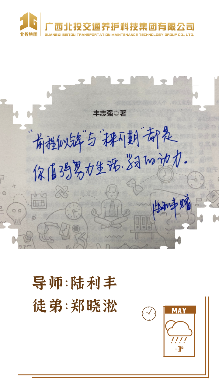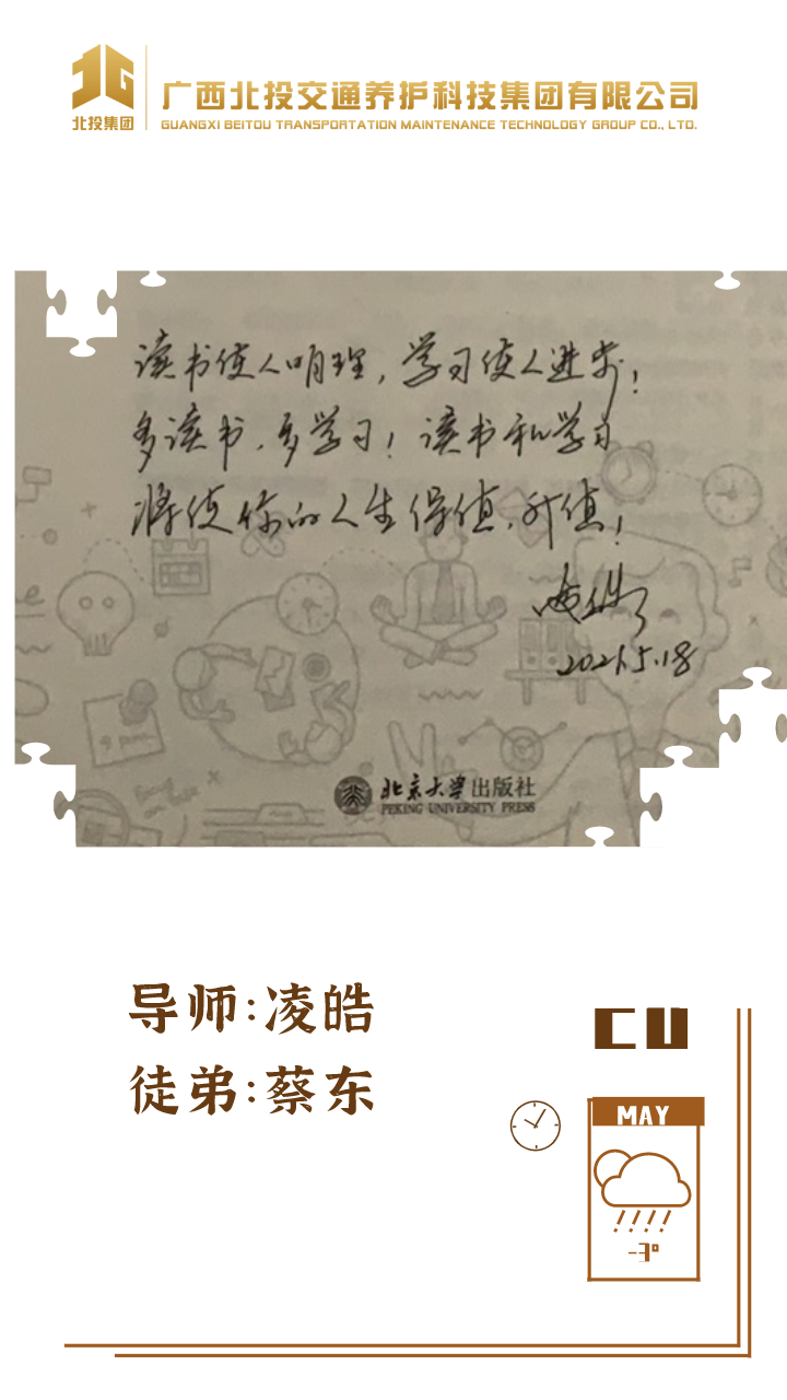 郑晓淞 奥克兰理工大学研究生:读万卷书,不如行万里路;行万里路,不如导师指路;感谢北投养护科技集团提供的“导师带徒”平台,给了我们快速成长的机会,能以“带”提升能力,以“带”促进沟通,以“带”助力发展,为养护事业添砖加瓦!